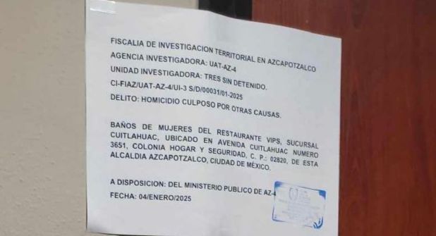 El testimonio surgió a raíz de una publicación en la página de 'X', de @Azcapo_Denuncia, donde se compartieron fotografías que muestran la puerta del baño del restaurante Vips Cuitláhuac sellada con dos hojas de papel oficiales de la Fiscalía General de Justicia (FGJ) de la Ciudad de México.
