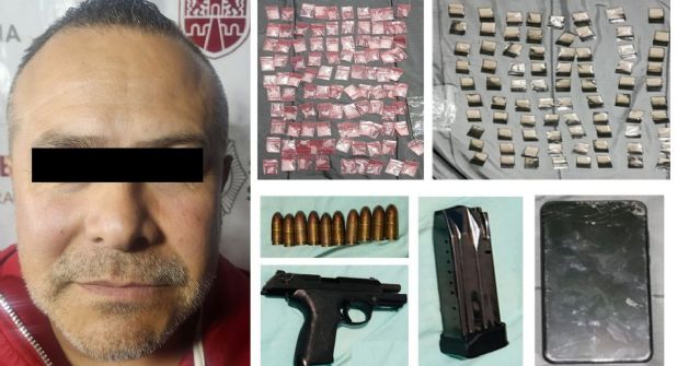En el lugar se aseguraron 90 dosis de presunta cocaína, 99 de posible crystal, 500 gramos de aparente marihuana, un arma de fuego corta, un cargador con 10 cartuchos útiles, dos teléfonos celulares y una identificación.