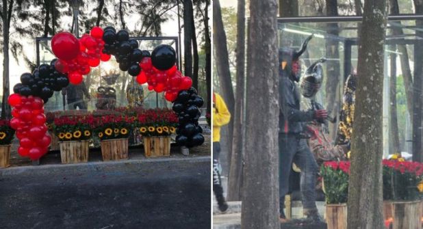 En un video difundido en 'X', se observa a un grupo de personas sacar una escultura del Diablo y colocarla dentro de un espacio enmarcado con cristales, rodeado de flores amarillas y rojas.