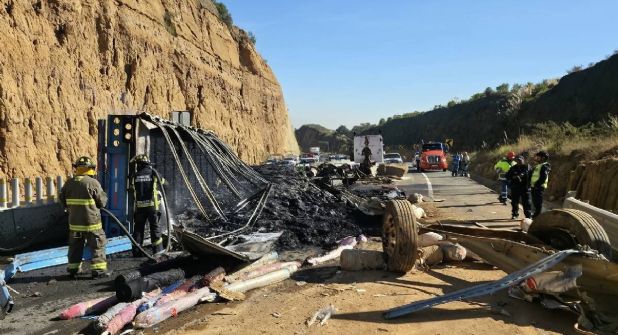 Esta mañana, un camión de carga se incendió debido al fuerte impacto que tuvo contra un muro de contención, a la altura del Km 6 en la autopista Naucalpan-Toluca, en los límites de la zona de Huixquilucan, en el Estado de México.