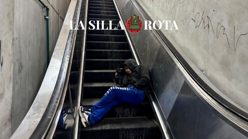 En plena hora pico, un hombre duerme sobre los peldaños inmóviles de una escalera eléctrica que debería conectar el Metro, Metrobús y Mexibús en Indios Verdes. A un costado, en las escaleras fijas, usuarios en muletas y con bastones suben y bajan con dificultad.