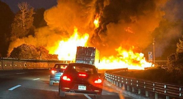 La circulación en la Autopista México-Puebla permanece cerrada en ambos sentidos durante la noche de este sábado, después de la volcadura e incendio de un tractocamión tipo pipa que transportaba gasolina.