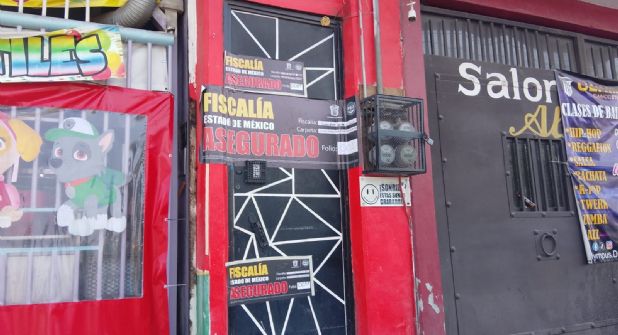 El acceso principal está cerrado, se encuentran tres sellos de la Fiscalía General de Justicia del Estado de México, con los folios 01, 0059 y 089, uno corresponde a la agencia especializada de combate a la delincuencia, otra al área de homicidios y la tercera indica agencia especializada.