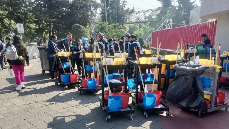 Como parte de su protesta, los 65 trabajadores salieron del Centro Médico con sus escobas, cubetas de plástico, y carritos recolectores de desperdicios, y por momentos bloquearon la lateral de Paseo Tollocan.