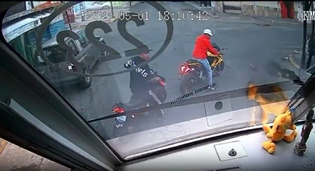 Las imágenes muestran cómo varias personas en motocicleta le cierran el paso, varios hombres se acercan al autobús para golpear la carrocería y ventanas, exigiendo les abriera la puerta del autobús.