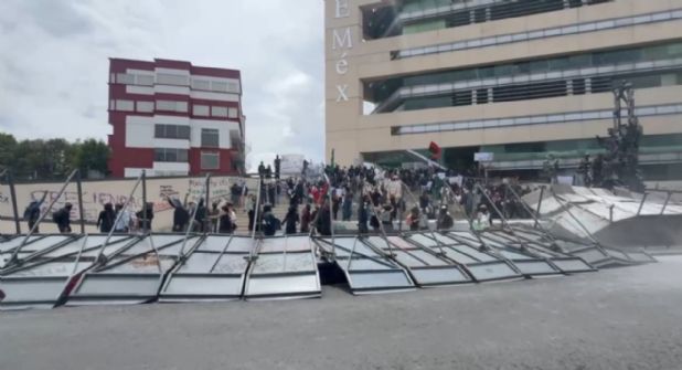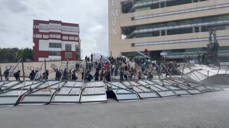 Aun cuando el edificio de administración de la UAEMex estaba resguardado con placas metálicas, los jóvenes estudiantes derribaron el cercado de acero, subieron la escalera y a golpes tiraron la puerta principal de vidrio.