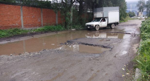 Frente a la base de combis de la empresa Izgasa, no se distingue si hubo ahí pavimento, la profundidad de los baches es impredecible, no se ve y sólo los conductores se dan cuenta al caer las llantas delanteras.