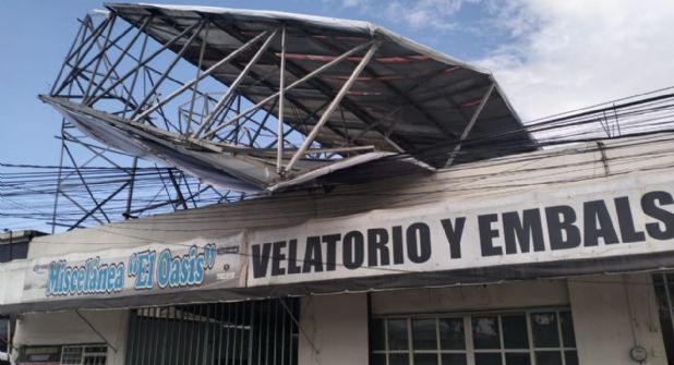 En el punto están laborando bomberos y elementos de rescate urbano para retirar láminas que están en riesgo de desprenderse y evitar mayores riesgos.
