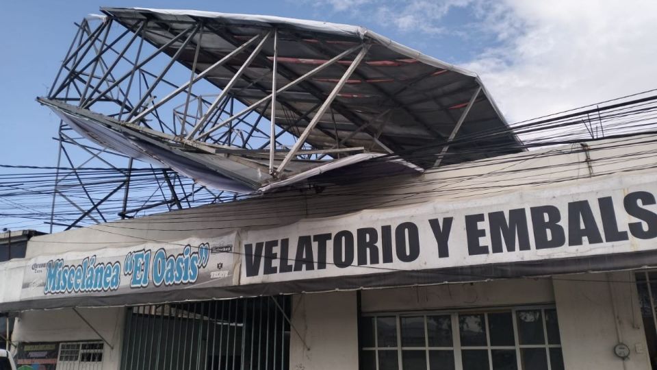 La estructura metálica cayó sobre la loza de dos locales, una miscelánea abandonada y un velatorio, sin que se reporten personas lesionadas, solo daños materiales.