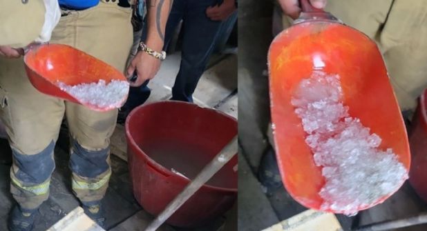 Al continuar la revisión, fueron localizados varios bultos de sosa cáustica; cuatro garrafones con capacidad cada uno de 50 litros llenos de un químico desconocido; dos hornillas con utensilios tipo ollas, con probables químicos; un enfriador; tres mesas de trabajo; tres coladores; un horno industrial, así como diversos botes y contenedores de plástico y dos mascarillas de gas industrial, además de aproximadamente 100 kilogramos de material en bruto de posible droga conocida como cristal y piedra.