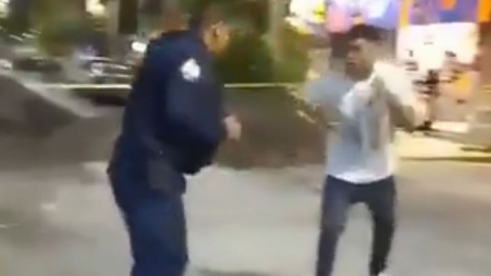 El joven de 26 años no acató la orden y respondió con empujones, lo que derivó en un intercambio de golpes mientras transeúntes grababan la escena y pedían al oficial detener la pelea. En el forcejeo, el motociclista lanzó patadas y puñetazos.