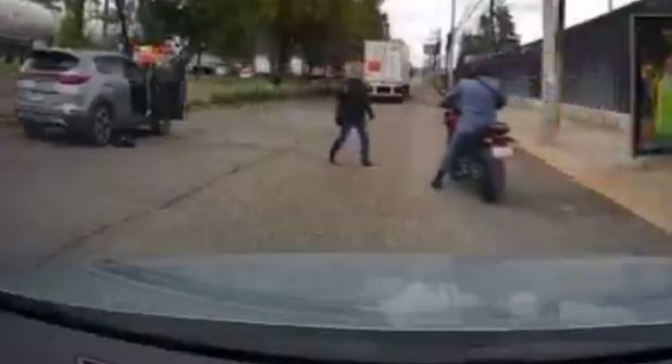 En el video de 46 segundos, el sujeto armado cierra la puerta del auto de la víctima y camina para subirse a una segunda motocicleta de color rojo con un cuarto cómplice, para después huir del lugar.