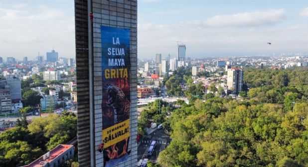 Al menos 9 manifestantes de la organización Greenpeace, entre hombres y mujeres escalaron la Estela de Luz, donde desplegaron una manta de 27 metros en una de sus caras del monumento, con el mensaje: "La Selva Maya grita, Semarnat Sálvala". En un comunicado en sus redes señalaron que la protesta busca visibilizar la devastación de la Selva Maya y exigir al gobierno mexicano medidas inmediatas para su protección.