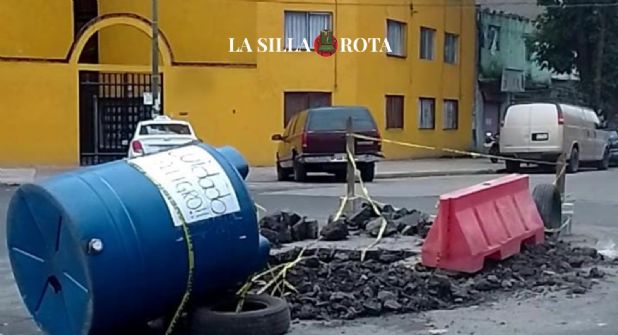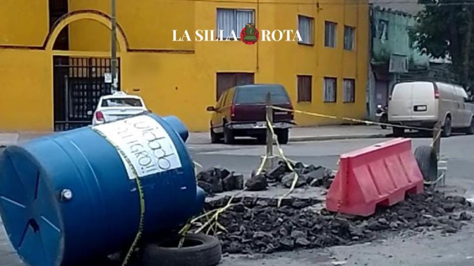 A mitad de la calle se encuentra un cerco improvisado por parte de vecinas y vecinos de la colonia Doctores, todo con la intención de advertir sobre un socavón que se formó y que nadie ha atendido.
