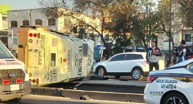 Tras el impacto, la camioneta de valores quedó volcada contra las rejas del Metro de la Línea 1. Personal de Protección Civil del Metro y elementos de la red están evaluando los daños a la estructura. El accidente también derribó un semáforo.