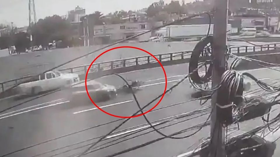 Las imágenes muestran la circulación de una motocicleta y un automóvil en los carriles con dirección a la Ciudad de México. En la secuencia se observa el instante en que el vehículo particular alcanza a la unidad de dos ruedas y se produce el impacto.