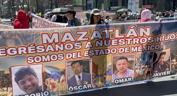 Familiares de los turistas desaparecidos en Mazatlán, Sinaloa, bloquean Eje Central y avenida Juárez, en el Centro Histórico de la Ciudad de México para pedir ayuda al gobierno federal para ayudar a localizar a cuatro hombres originarios del Estado de México.