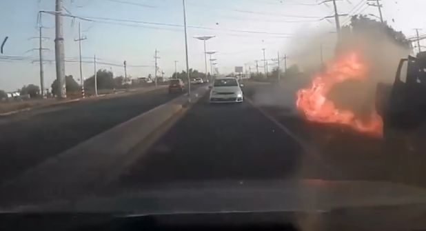 En el video se observa que el reloj marcaba las 18:06 horas, cuando la camioneta explotó y se incendió, debido a ello, el conductor perdió el control y el vehículo impactó con el muro de contención de la autopista México-Pachuca.