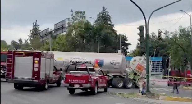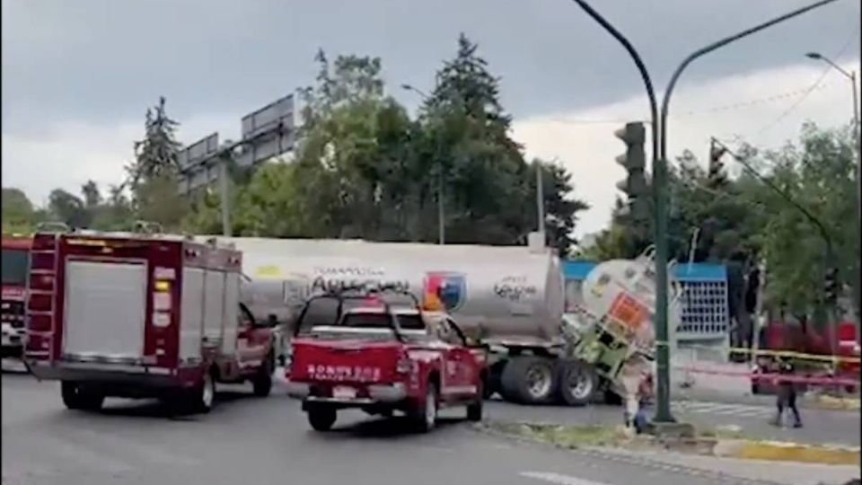 Una pipa de doble remolque cargada con combustible por poco termina volcándose en Sur 122 y avenida de Las Torres, en la colonia José María Pino Suárez, en la alcaldía Álvaro Obregón.