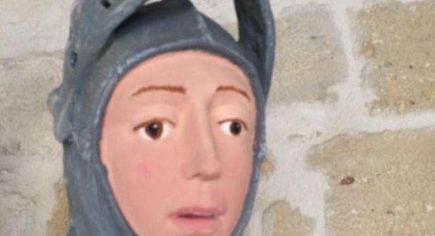 Se trata de San Jorge, un tallado presente en la localidad de San Miguel de Estella en Navarra. La escultura, que presenta al santo sobre un caballo para vencer a un dragón, ha sido restaurada en colores uniformes que la hacen ver como si se tratara de un muñeco de torta.