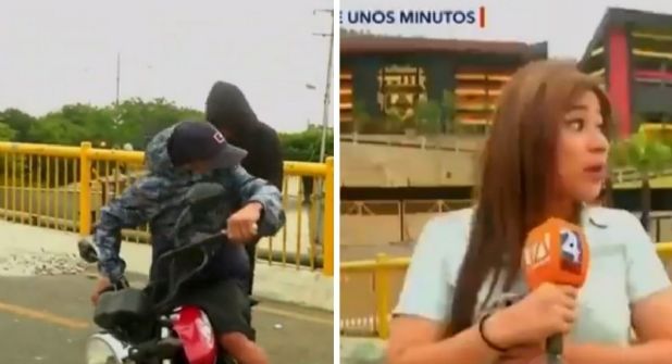 Dos ladrones en una motocicleta intentaron asaltar el martes a un equipo de la cadena de televisión Teleamazonas de Ecuador, el suceso ocurrió mientras una reportera transmitía en vivo desde las afueras del estadio Monumental, donde el sábado se jugará la final de la Copa Libertadores.