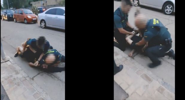 Uno de los policías tuerce sus brazos mientras que otro policía lo sujeta del cuello con fuerza mientras clama ayuda a otro guardia para que le apoye poniéndole las esposas al hijo de Ángel Bejarano.