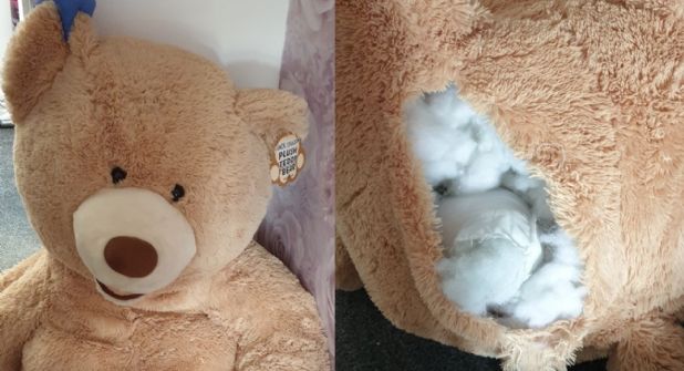 En ese momento, fue cuando Joshua decidió esconderse en el oso de peluche gigante, que mide cerca de 1.5 metros, que tenía su novia en su habitación. Por lo que, descosió la parte inferior del peluche y se metió dentro con todo y relleno.
