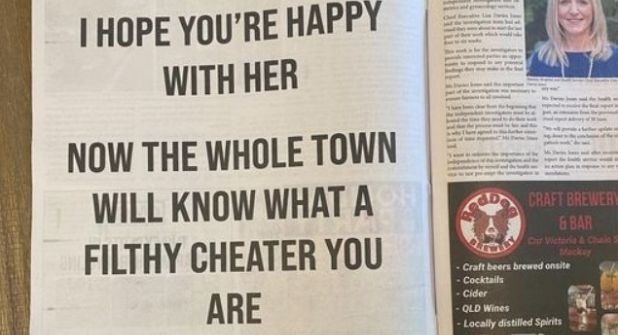 Una historia de infidelidad quedó exhibida en el periódico de Mackey, ubicada en Queensland, Australia, luego de que la mujer víctima del engaño decidiera exponer a su pareja y hacerlo viral.
