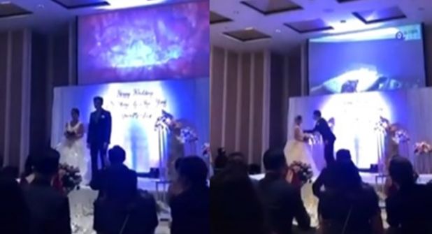 Sin que nadie lo pensara, el novio dejó pasar las cosas y fue hasta el día de la boda que utilizó una pantalla para proyectar un video comprometedor de la novia con su amante.