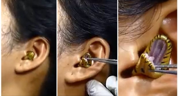 En el video se puede ver a un presunto médico usando unas pinzas intentando extraer una serpiente negra con amarillo que asoma la cabeza a través del oído de la mujer.