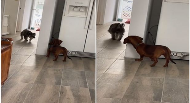 En el clip se ve a uno de los perritos escondido junto al refrigerador, mientras que el otro, que está al fondo del pasillo, camina de manera hacia la cocina buscando a su compañero.