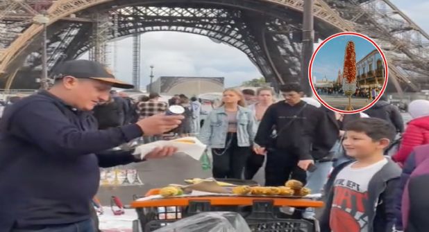 En las imágenes se puede ver a este joven a unos pasos de la icónica Torre Eiffel gritando “maíz, maíz, maíz”, mientras de la nada se acerca un niño a comprarle un elote bien doradito.