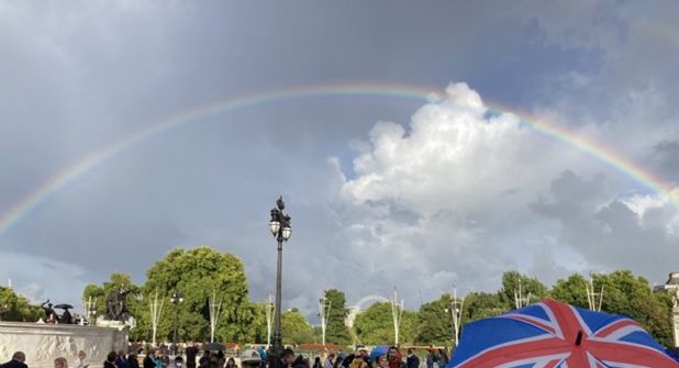 La multitud congregada afuera del Palacio de Buckingham se mostró sorprendida por la aparición del arcoíris en un jueves llovioso en Londres.