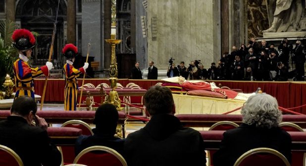 Benedicto XVI yace en el centro de la basílica, iluminado por un haz de luz que se escurre desde la cúpula, escoltado por dos guardias suizos con alabardas y junto a un cirio encendido.