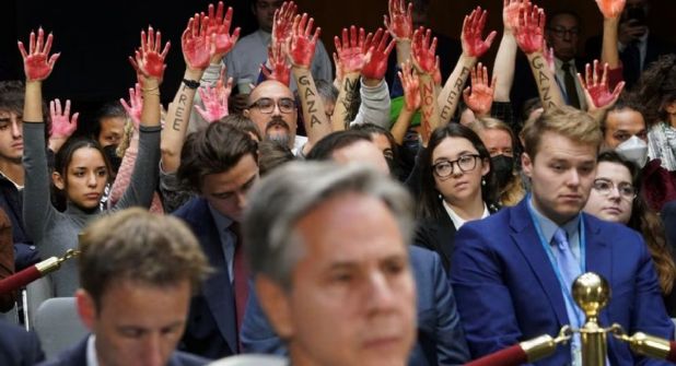 Las interrupciones se sucedieron varias veces, con un Blinken con rictus serio, y en cada ocasión los manifestantes fueron sacados de la sala por las fuerzas de seguridad.