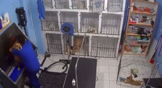 En las imágenes captadas por la cámara de seguridad del spa canino, el empleado le alza la orejas del lomito, lo abraza e incluso baila pegadito a él como si fuera su pareja ante la mirada desconcertada del can, los hechos se habrían registrado en una veterinaria en Chile.