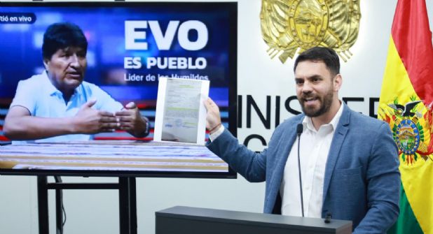 “Señor Morales, si usted no tiene nada que esconder entregue el vehículo a la Policía Boliviana para hacer un microaspirado y saber qué tenía el vehículo adentro; señor Morales quién les dio permiso de portar armas de fuego, quiénes eran las personas que se encontraban armadas en su vehículo”, preguntó el ministro.