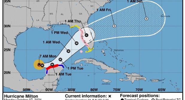 Según la trayectoria pronosticada, Milton se moverá cerca o justo al norte de la península de Yucatán (México) hoy y el martes, luego cruzará el este del golfo de México y "se acercará a la costa oeste de la península de Florida el miércoles".
