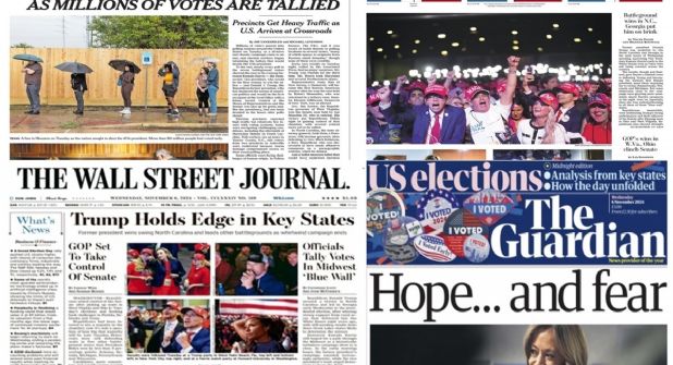 The Guardian subrayó esta división con una portada que reflejaba la dualidad de emociones: esperanza y miedo, con una imagen de Kamala Harris como representante de las aspiraciones demócratas que aún intentan resistir en los estados clave.