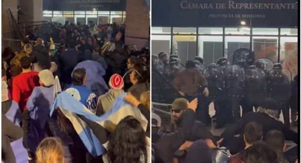 En redes sociales han circulado videos de la manifestación de este jueves, en los cuales, se puede observar cómo los manifestantes sobrepasaron las vallas de seguridad en la puerta de la sede de la cámara legislativa de la provincia fronteriza con Paraguay y Brasil.