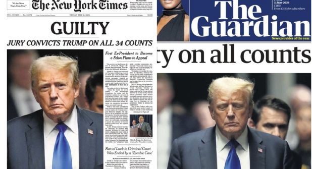 Distintos medios en Estados Unidos, como era de esperarse, dedicaron sus primeras planas al caso Trump, resaltando la decisión del jurado de declararlo culpable. El diario The New York Times puso en grande la palabra "Guilty", así como una imagen del expresidente estadounidense.