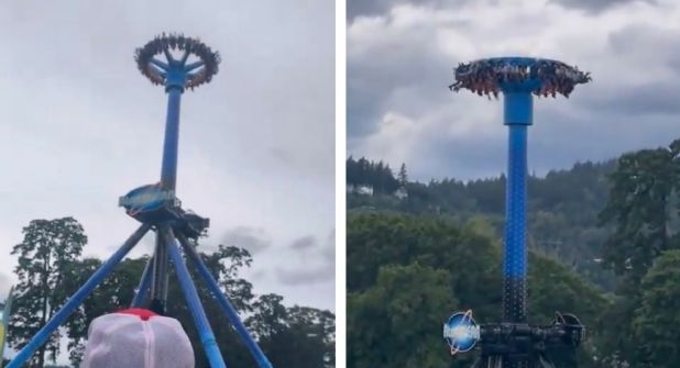 A través de redes sociales, circula un video que muestra el momento en que la atracción “AtmosFEAR”, del parque Oaks Park, ubicado en Oregon, se detiene mientras giraba y deja a los pasajeros suspendidos en el aire. Esta atracción opera como un péndulo y gira a los pasajeros hasta dejarlos completamente boca abajo.