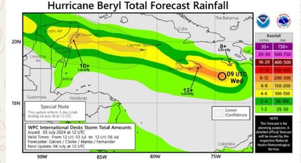 El Centro Nacional de Huracanes (NHC, en inglés) de Estados Unidos pronostica cierto debilitamiento durante hoy o mañana, jueves, pero Beryl será un ciclón mayor o estará en una intensidad cercana a un huracán mientras pasa cerca de Jamaica.