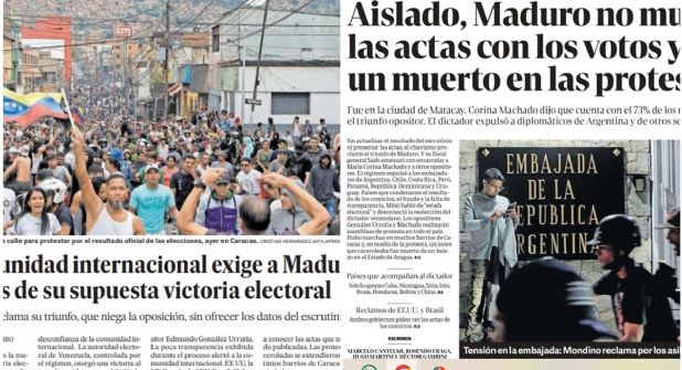 El diario argentino El Clarín informó sobre la expulsión de diplomáticos de varios países por parte del régimen de Maduro, en respuesta a las acusaciones de fraude y falta de transparencia. La oposición, encabezada por Edmundo González y María Corina Machado, ha organizado asambleas de protesta en todo el país. En medio de las manifestaciones, un joven fue asesinado en el estado de Aragua. El periódico también destacó el apoyo limitado a Maduro, principalmente de países como Cuba, Nicaragua, Rusia y China.