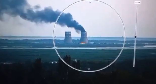 En un video publicado por Zelenski, grabado desde territorio bajo control ucraniano, mostraba un gran fuego en la base de una de las torres de refrigeración de la central y densas nubes de humo que surgían de ella.