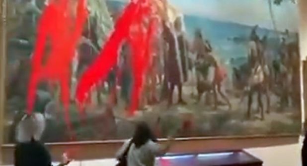 Dos activistas del movimiento de desobediencia civil no violenta Futuro Vegetal lanzaron este domingo pintura roja biodegradable sobre un cuadro de Cristóbal Colón en el Museo Naval de Madrid, en un acto de protesta por la celebración de la Fiesta Nacional y para denunciar el actual neocolonialismo extractivista que explota sus recursos naturales.
