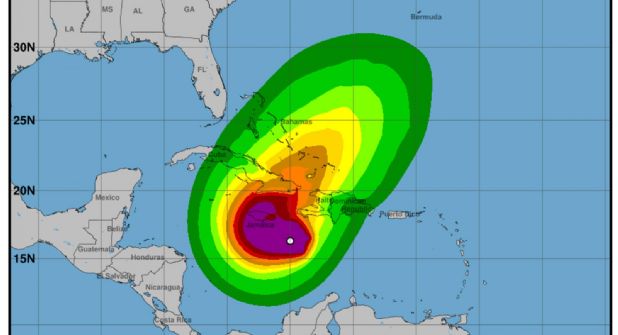 El Centro Nacional de Huracanes (NHC) lo ubicó a 241 kilómetros al sureste de Jamaica. Se prevé que el lento movimiento del sistema (cerca de 6 km/h) provoque grandes y catastróficas inundaciones, descargando hasta 101 centímetros (40 pulgadas) de lluvia sobre la isla.