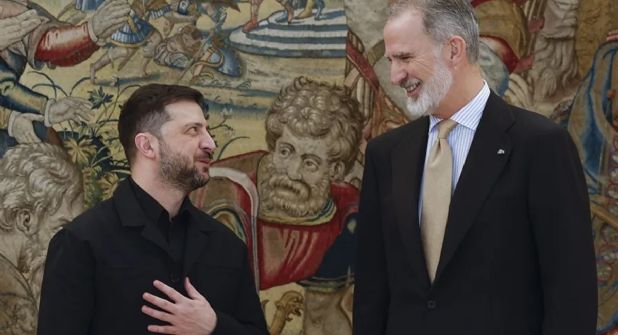 Felipe VI reafirmó este martes al presidente de Ucrania, Volodímir Zelenski, el apoyo español a su país en todos los ámbitos, como el diplomático, financiero y militar, todo el tiempo que sea necesario, además de reiterar el respaldo al proceso de su adhesión a la Unión Europea (UE).