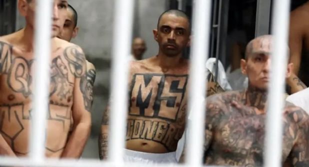 En un bloque de celdas con presos salvadoreños, los guardias formaron a una docena de ellos cerca del frente de su celda y les ordenaron que se quitaran las camisetas y los cubrebocas. Los hombres llevaban abundantes tatuajes, algunos con las siglas MS (Mara Salvatrucha) en el pecho.