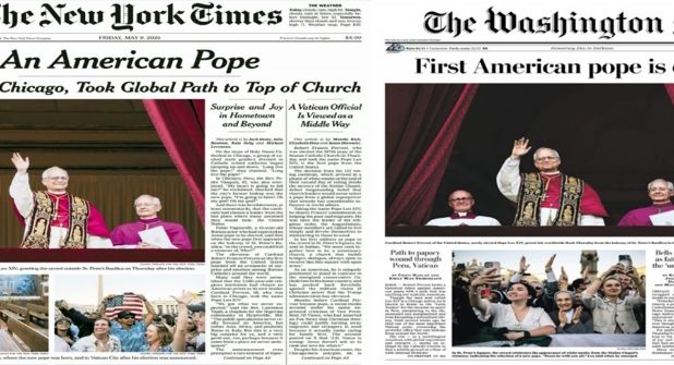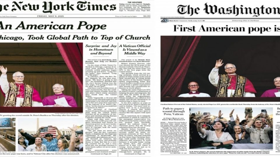 En Estados Unidos, The New York Times titula "Un papa americano", haciendo énfasis en la sorpresa y la alegría provocadas por su elección tanto en su ciudad natal, Chicago, como en otros lugares. El periódico describe su camino hacia el papado como “global”, destacando su paso por América Latina y su trabajo en el Vaticano. Lo presenta como una figura de consenso, “un camino medio”, en una Iglesia diversa.